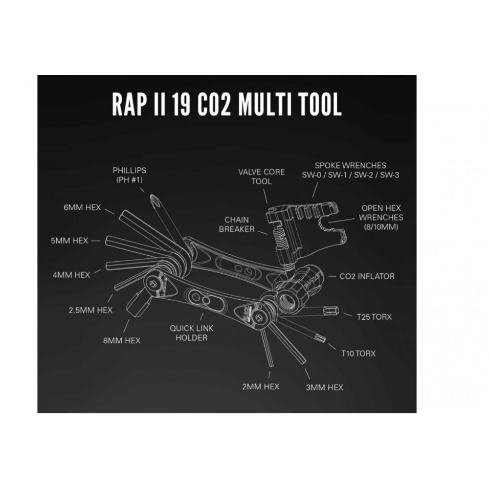 Combinant estil, tecnologia i valor final, les multieines per a bicicletes de la sèrie Rap II ofereixen un rendiment sense igual al preu. Funcions: Suport magnètic denllaç ràpid. Clau Allen 2/ 2.5/ 3/ 4/ 5/ 6/ 8 mm. Tornavís Phillips. T10/T25 Torx. Tronxacadenes. Clau de 8/10 mm. 4 claus de radis. Inflador de CO2 |