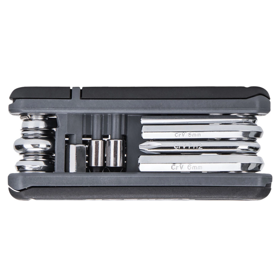 Compartiments per a puntes hexagonals T15, T25 i de 8 mm Els laterals del cos de Hexus® es poden desmuntar per fer-los servir com a palanques per a pneumàtics. Eina integrada per a nuclis de vàlvula Presta, que permet prémer o afluixar els nuclis de vàlvula Presta de dues peces. Funcions: 21 Eines