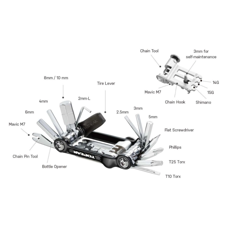 El cos dʻalumini forjat i las eines dʻacer de la completa Multieina Topeak Mini 20 Pro permeten sortir a rodar amb la seguretat de poder resoldre fàcilment las incidències tècniques més habituals.