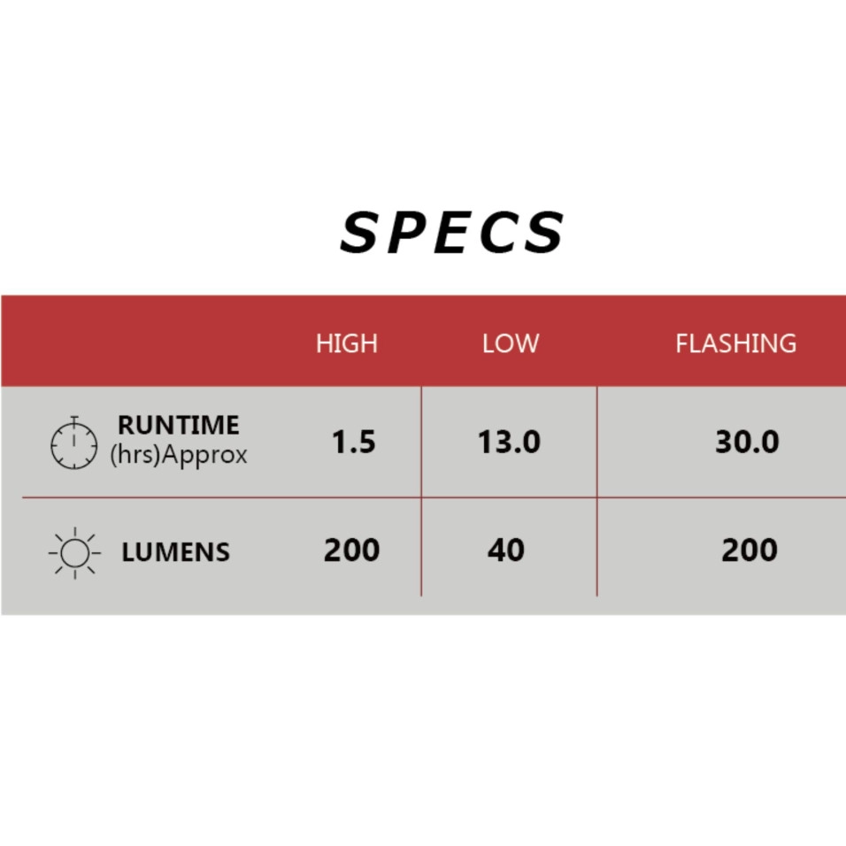 Característiques: – Llum recarregable (200 lm) – Fes ample amb tecnologia de lent OptiCube – Excel·lent visibilitat lateral – Indicador de bateria baixa (s'il·lumina en vermell amb menys del 20% de bateria restant) – USB recarregable (cable micro-USB inclòs) – Funció de memòria de manera – Quatre modes de llum (alta / baixa / hiperconstant diürn / parpellejant) – Activa el mode alt amb doble clic al botó d'encesa – Suport FlexTight - El botó d'alliberament millorat ha facilitat l'extracció de la unitat de llum del suport – Suport per a casc i suport de forquilla central (opcional) |
