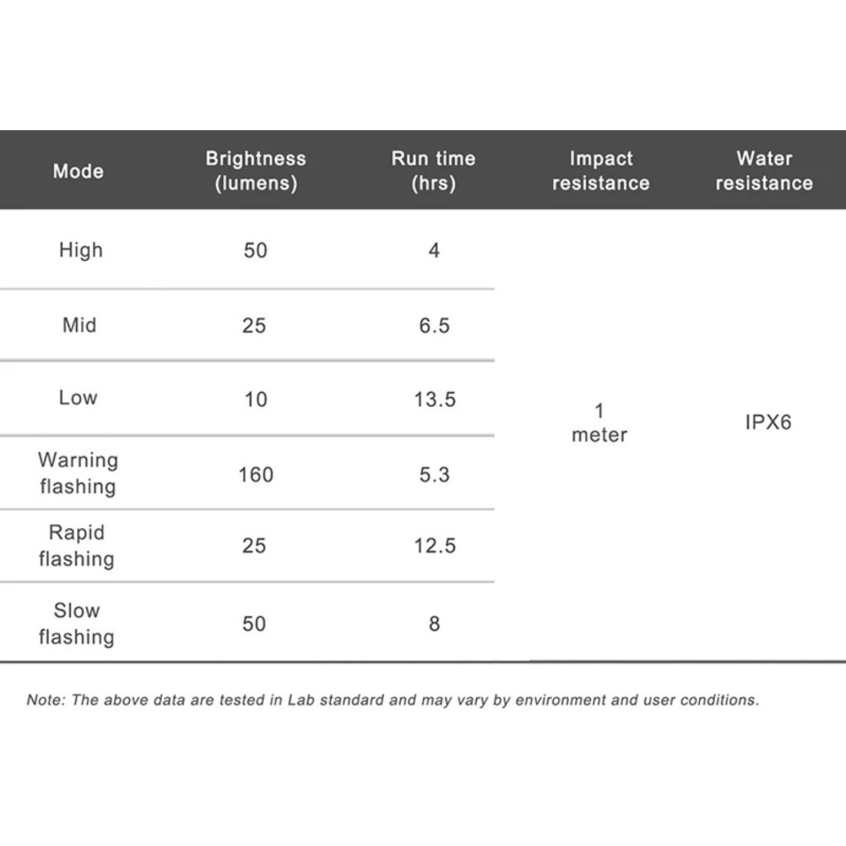 Característiques: La Llum Davantera Ravemen FR160 és una llum que permet ser vist únicament. La Llum Davantera Ravemen FR160 no es pot utilitzar amb ordinadors Wahoo sense el QTM01 La Llum Davantera Ravemen FR160 no es pot utilitzar amb ordinadors Bryton sense el QTM03 La Llum Davantera Ravemen FR160 no és compatible amb el suport per a barra de triatló/contrarellotge de Garmin . Mode intermitent d'advertiment visible durant el dia: Amb el disseny especial del patró de parpelleig, el cridaner mode de parpelleig d'advertència de FR160 el mantindrà visible durant la conducció diürna; 3 modes constants i 3 modes intermitents per a diverses situacions de conducció. Lent gran angular amb visibilitat lateral: Augmenti la visibilitat lateral quan circuli per la cruïlla. Senzill i versàtil: La llum es pot muntar entre el suport per a bicicletes de Garmin i las ordinadors; També hi ha peces reemplaçables (es venen per separat) disponibles per las ordinadors Wahoo o las ordinadors Bryton ; per las ordinadors Wahoo o las ordinadors Bryton i els suports, reemplaceu l'inserit i la pestanya de muntatge de la llum. Port de càrrega USB-C: Connector reversible per carregar la llum fàcilment i sense necessitat de voltejar buscant lorientació correcta; indicador de càrrega vermell integrat. Disseny de resistència alʻaigua IPX 6: La llum es pot utilitzar quan es condueix sota la pluja. (Assegureu-vos que la tapa del port de càrrega estigui muntada de manera segura després de la càrrega) Bateria: bateria recarregable de polímer de liti de 380 mAh/3,7 V Dimensions (far): 75 mm (L)*57 mm (ample)*21 mm (alt) Pes (Far): 55g |