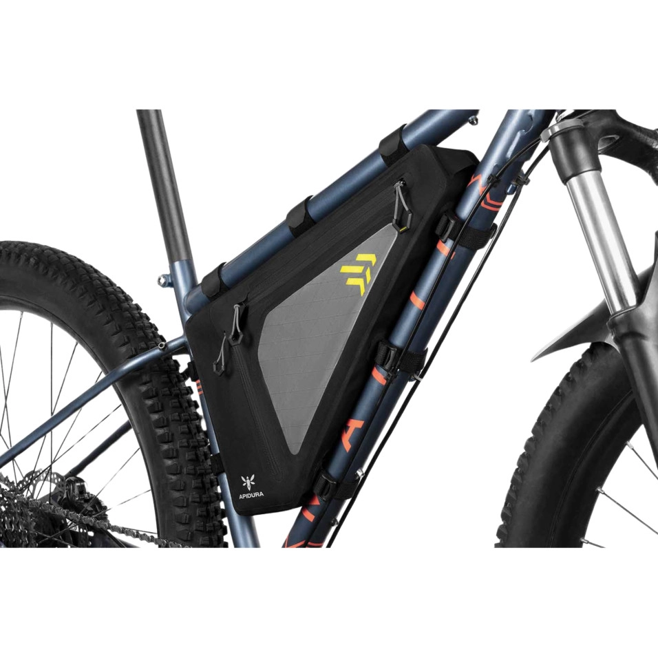 Altament versàtil, la Bossa Quadre Apidura Backcountry Full Frame Pack 4L s'ha dissenyat per transportar càrregues grans i pesades en llargues distàncies ia través de senders tècnics. La bossa de quadre encaixa al triangle principal de la bicicleta, proporcionant un gran espai per a objectes voluminosos, des d'estris de cuina fins a eines pesades i una bossa d'aigua. El baix centre de gravetat resultant fa que la bossa tingui un efecte mínim en la conducció, alhora que ofereix un gran volum despai demmagatzematge.