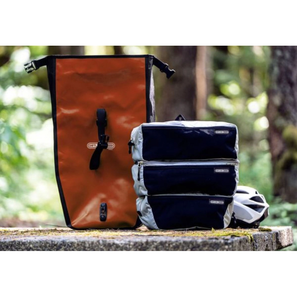 Amb les nanses a la part superior, els organitzadors poden extreure's amb facilitat de l'alforja. Cada bossa compta a l'interior i l'exterior amb una bossa de xarxa addicional per guardar articles petits que voleu tenir ràpidament a l'abast de la mà. Atès que es tracta d'un sistema modular, les bosses també es poden emprar en forma individual, podent portar en una excursió curta per exemple tan sols una o dues bosses. DETALLS + Sistema modular també emprable en forma individual + Adequat com a inserit per a totes les alforges ORTLIEB Back·Roller, Bike·Packer i Velo ·Shopper |