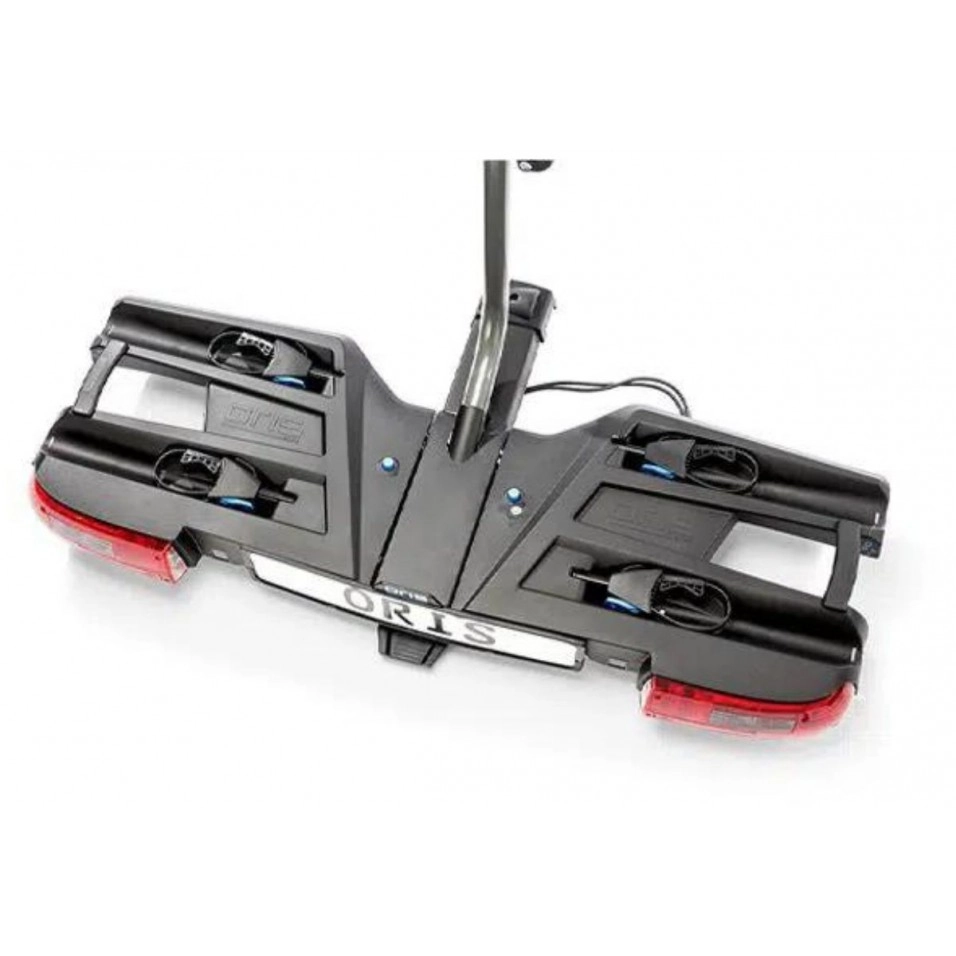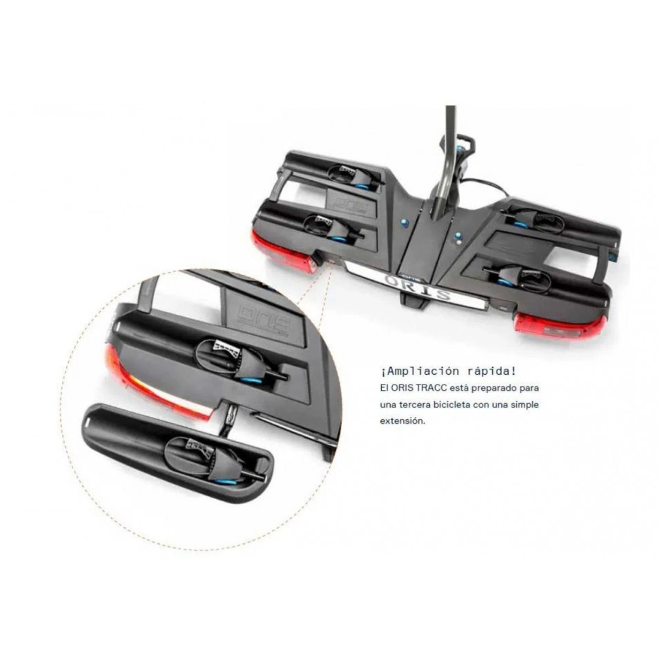 El Portabicicletes Bola Oris Tracc permet transportar 2 bicicletes, tant tradicionals com elèctriques. Aquesta capacitat de càrrega es pot ampliar a 3 bicicletes amb una extensió opcional. El Portabicicletes Oris Tracc és un portabicicletes per a bola de remolc molt resistent i estable, fàcil d'usar, i amb un còmode sistema de plegat per permetre l'accés al maleter.