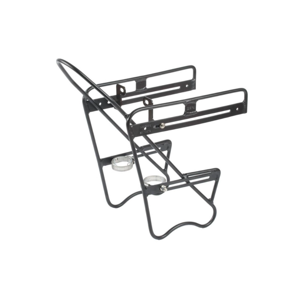 Ús davanter per a bicicletes de: 26" i 28" – tot tipus de forquilles. Muntatge: regulable i adaptable Superior: per abraçadora o esquadres V-Brakes segons la forquilla (tradicional o telescòpica). Inferior: per abraçadora Material: estructura d'alumini 6061 súper resistent. Càrrega màxima: 2 x 9 kg. Dimensions laterals: 300 x 295 mm. Pes segons fabricant: 750 gr. |