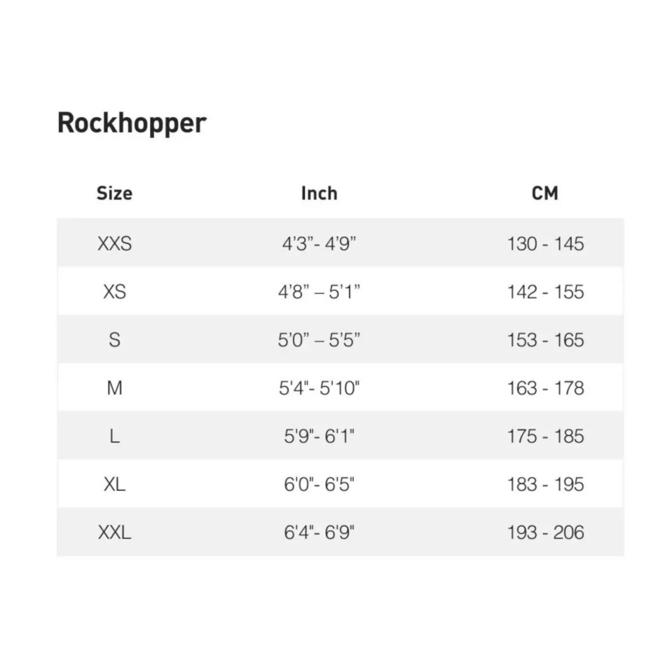 DETALLS Presentat al nostre lleuger però durador alumini Premium A1, el quadre d'alumini conificat de la Rockhopper compta amb tubs diagonals i superiors hidroformats per mantenir el pes baix i la resistència alta, alhora que proporciona una major distància a terra, un guiat intern del cablejat i compatibilitat amb tiges telescòpiques. Per garantir que la Rockhopper ofereix tant el millor ajustament com el millor rendiment per a cada persona, independentment de la seva mida, hem aparellat cada mida de quadre Rockhopper amb la mida de roda òptim El resultat és una Rockhopper que s'adapta a cada ciclista i la seguretat que cada Rockhopper roda amb la roda més manejable per a la seva mida de quadre. Els frens de disc hidràulics Shimano són molt agressius però lliuren la seva potència amb un tacte refinat i intuïtiu per aconseguir un conjunt que supera amb escreix la seva categoria. Mantingueu las coses senzilles amb una transmissió SRAM 1x duradora amb una gran autonomia i un desviador del darrere equipat amb embragatge que manté la seva conducció silenciosa i la seva cadena al seu lloc. Combina els fiables boixes Formula amb les nostres llantes Stout sense ganxos de 25 mil·límetres de diàmetre intern per aconseguir un joc de rodes resistent, lleuger i durador. |