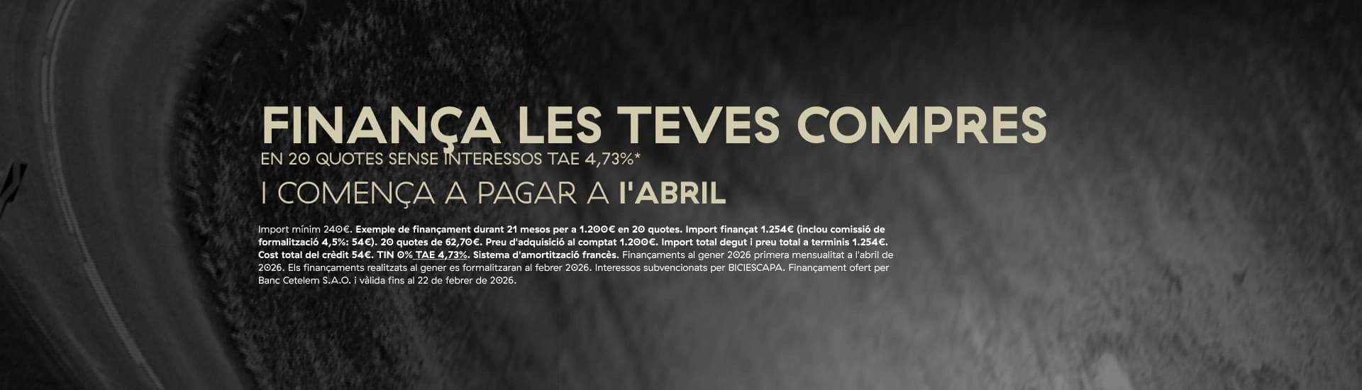 *Import mínim 240 €. Exemple de finançament durant 21 mesos per a 1.200 € en 20 quotes. Import finançat 1.254 € (inclou comissió de formalització del 4,5 %: 54 €). 20 quotes de 62,70 €. Preu d’adquisició al comptat 1.200 €. Import total degut i preu total a terminis 1.254 €. Cost total del crèdit 54 €. TIN 0 % TAE 4,73 %. Sistema d’amortització francès. Finançaments realitzats al gener de 2026 amb primera mensualitat a l’abril de 2026. Els finançaments realitzats al gener es formalitzaran al febrer de 2026. Interessos subvencionats per BICIESCAPA. Finançament ofert per Banco Cetelem S.A.U. i vàlid fins al 22 de febrer de 2026.