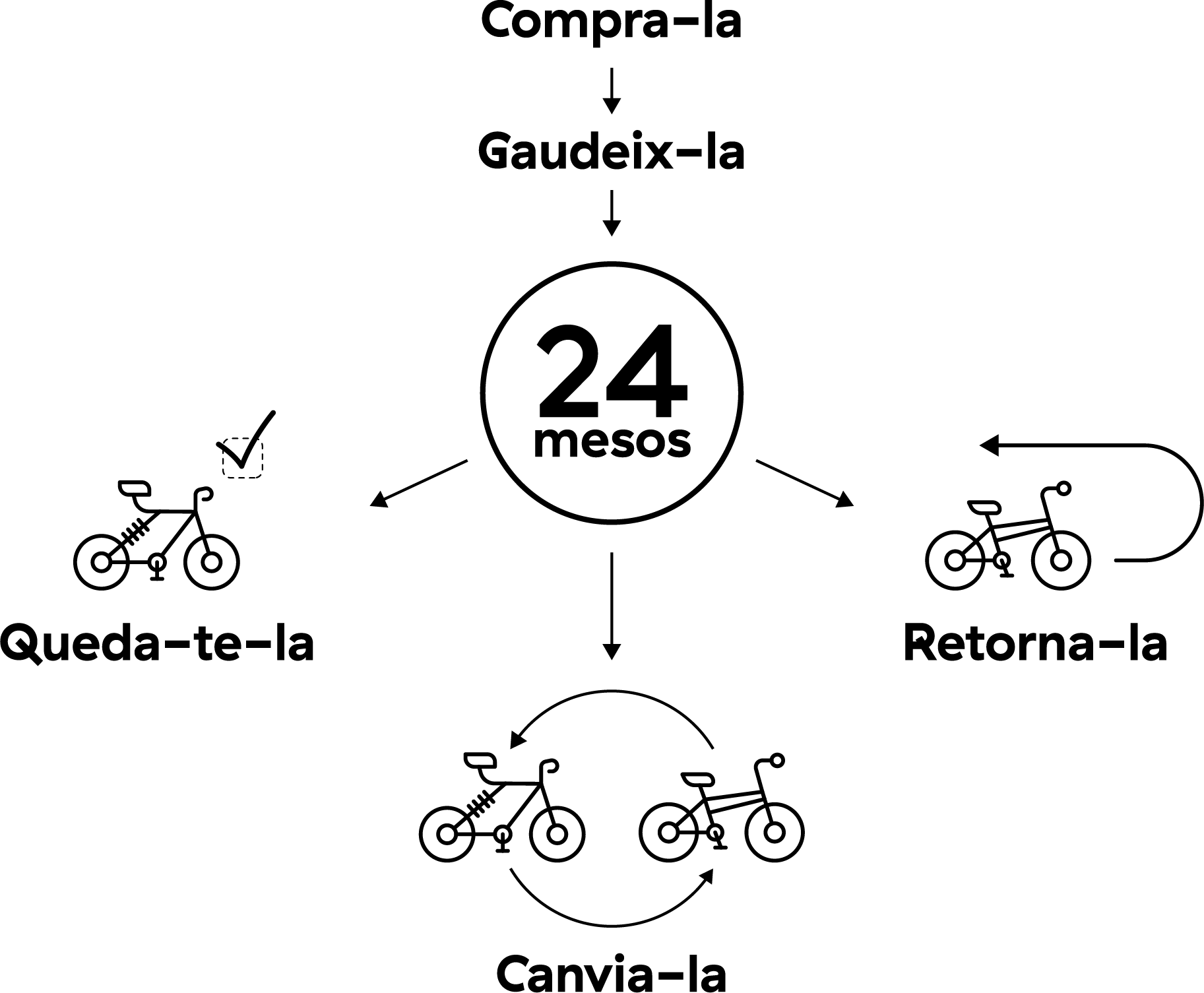A Escapa t'oferim la possibilitat de comprar la teva nova bici i al cap de 24 mesos, pots decidir si prefereixes canviar-la per una de nova, tornar-la o quedar-te-la.