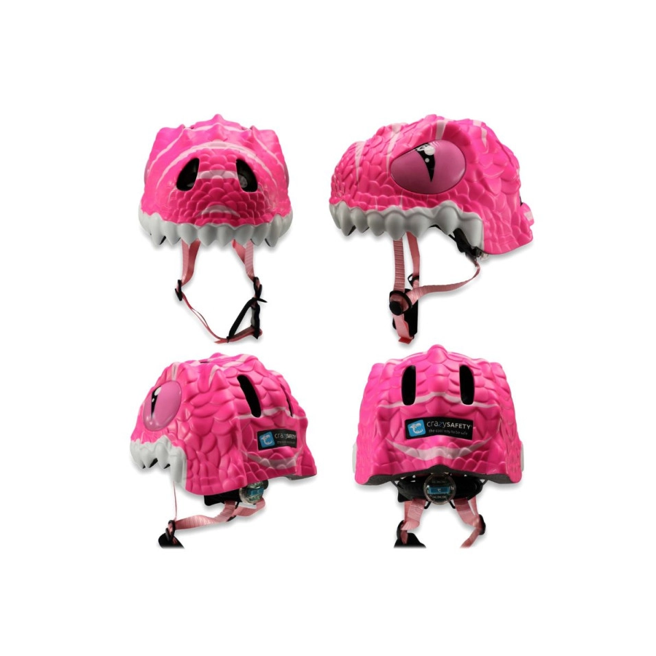 El Casc Crazy Safety Dragon és adequat per a nens de 2 a 7 anys. Tots els cascos Crazy Safety estan fabricats amb escuma EPS lleugera d´alta qualitat. Grandària ajustable amb el sistema d'ajust intern que canvia la mida del casc de 49cm a 55cm. La llum LED vermella de seguretat amb 3 funcions està incorporada al sistema d'ajust intern amb una roda giratòria, i la pila és fàcil de canviar. 6 grans orificis de ventilació a la part davantera, superior i posterior proporcionen un bon flux daire. Tots els cascos Crazy Safety vénen amb una llum, un coixinet protector per a la barbeta, les corretges de color a joc i coixinets interiors extraïbles i rentables. El Casc Crazy Safety Dragon és ideal per anar amb bicicleta, monopatí, patinet, bici d'equilibri i patins.