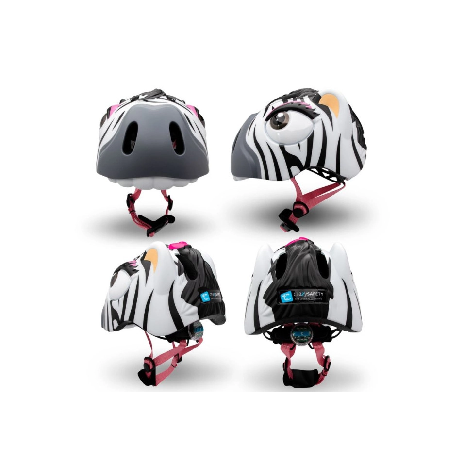 El Casc Crazy Safety Zebra és adequat per a nens de 2 a 7 anys. Tots els cascos Crazy Safety estan fabricats amb escuma EPS lleugera d´alta qualitat. Grandària ajustable amb el sistema d'ajust intern que canvia la mida del casc de 49cm a 55cm. La llum LED vermella de seguretat amb 3 funcions està incorporada al sistema d'ajust intern amb una roda giratòria, i la pila és fàcil de canviar. 6 grans orificis de ventilació a la part davantera, superior i posterior proporcionen un bon flux daire. Tots els cascos Crazy Safety vénen amb una llum, un coixinet protector per a la barbeta, les corretges de color a joc i coixinets interiors extraïbles i rentables. El Casc Crazy Safety Zebra és ideal per anar amb bicicleta, monopatí, patinet, bici d'equilibri i patins.