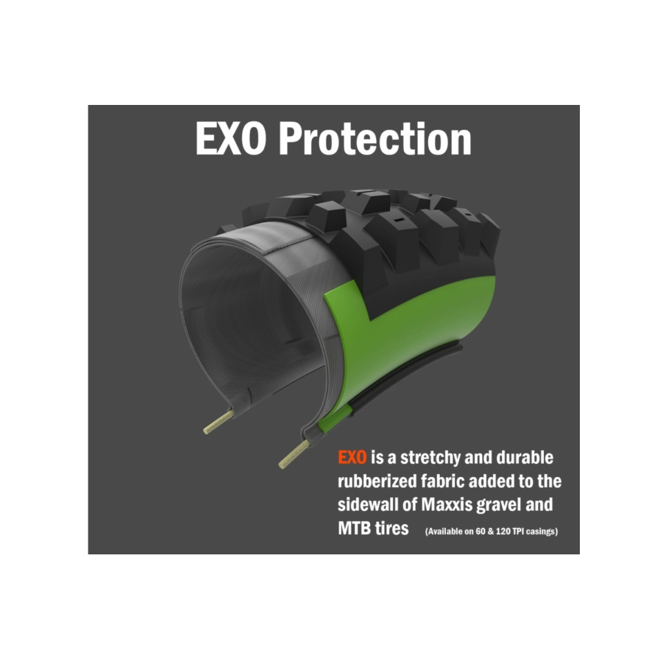 Els tacs laterals redissenyats ofereixen una superfície de contacte més gran per millorar l'adherència i l'estabilitat, especialment en terrenys durs. La banda de rodament central manté la disposició 2-3-2 de ràpid rodament, però ara compta amb tacs centrals dividits per millorar la frenada i l'adaptació al terreno . Els tacs de transició s'han desplaçat cap a fora per suavitzar las revolts. Perfecte com a pneumàtic davanter en bicicletes de trail de 130-140 mm o com a pneumàtic del darrere ràpid en configuracions de 150 mm+ en condicions seques. Combina molt bé amb el Forekaster o el Rekon per a una conducció equilibrada. Fes servir una llanta de 30-35mm d'amplada per obtenir el millor rendiment. Tubeless Ready (TR). Categoria: Trail , Enduro . Ús recomanat: Terreno sec, dur i rocós. Instal·lació recomanada: Davantera o posterior. Compost de triple capa PSI Max: 50psi Etrte: 61-122 TPI: 60 Tecnologies: DoubleDown (DD): és la nostra solució de carcassa per a curses d' enduro i ús amb bicicletes elèctriques. Dues capes del nostre lleuger material de carcassa de 120 TPI es combinen amb un inserit de butil als flancs per crear un pneumàtic molt durador amb més resposta als senders que un pneumàtic amb carcassa Downhill. Els pneumàtics DoubleDown són lleugerament més lleugers que els seus homòlegs Downhill, però el que realment els diferencia és la «sensació a les senderes». Alguns ciclistes poden preferir el gran amortiment que proporciona un pneumàtic amb carcassa Downhill. Els pneumàtics Maxxis Tubeless Ready (TR) ofereixen una millor tracció, menor resistència al rodolament i menys punxades en eliminar la càmera interior. Utilitzeu pressions més baixes per millorar l'adherència i el control . Busqueu la marca TR al flanc. EXO és un material resistent als talls i l'abrasió que s'afegeix als flancs de molts pneumàtics Maxxis per a bicicletes de muntanya i gravel . Aquest teixit d'alta densitat és lleuger i molt flexible, cosa que garanteix que el rendiment del pneumàtic no es vegi afectat. Tria la protecció EXO per a una major durabilitat en gravel , XC i recorreguts lleugers per senders. |