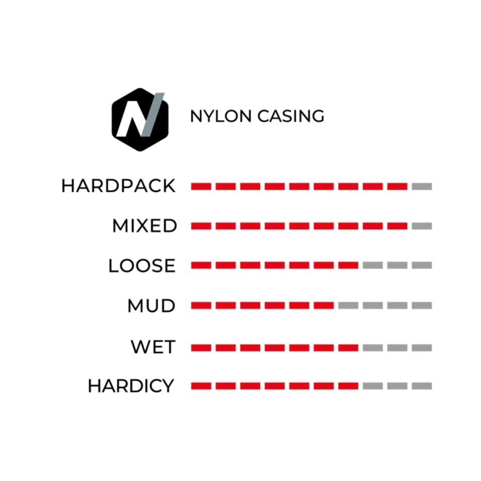 La línia central continua compta amb extensions desplaçades que estan laminades per multiplicar el nombre de vores que t'impulsen pel sender, i la laminació del darrere als tacs de les espatlles està angulada per prendre corbes ràpides en superfícies dures i relliscoses. Per pujar, agafar corbes o baixar pendents, cap pneumàtic és com el Mescal. Compost de grafè 1C Cautxú infós amb grafè per minimitzar la resistència al rodament i resistir les punxades. El grafè omple eficaçment els buits entre les molècules de cautxú, creant una estructura reforçada que és més lleugera, més eficient i també més duradora. Carcassa de 60TPI Dissenyades amb una construcció de niló 60-TPI que resisteix l'abrasió i les punxades alhora que manté la teva connexió amb el sender amb una flexibilitat de nivell mitjà. |