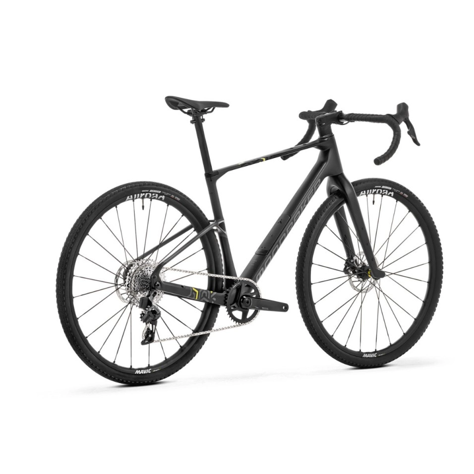 Das Mondraker Arid Carbon R 25 Fahrrad ist das primer Modell, das über das AXS-Getriebe von SRAM mit der Rival Etap -Reihe, einem 40-Kettenblatt und einer 12-Gang-Kassette (10-44) verfügt. Bei Las räder handelt es sich um las Allroad SL mit 25 mm Mavic in Kombination mit 45 mm Maxxis Reaver-Reifen.