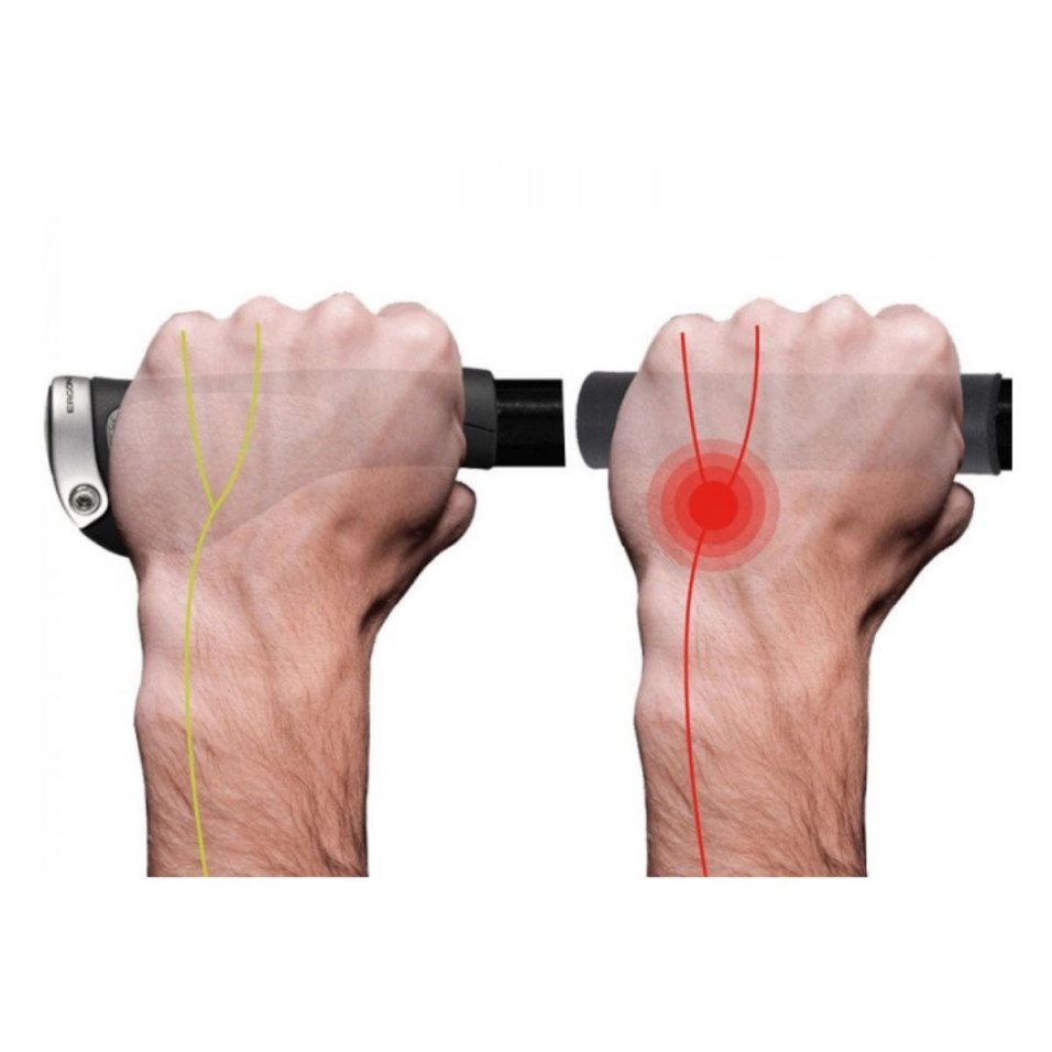 Nervenentlastung Beim Fahren stützen Ihre Hände einen Großteil Ihres Oberkörpergewichts auf den Lenker und üben so einen hohen Druck auf eine relativ kleine Grifffläche aus. In vielen Fällen wird dadurch der äußerst empfindliche Nervus ulnaris eingeklemmt, der in der Nähe der Basis der Handfläche, in der Nähe des kleinen Fingers und in der Nähe der Hautoberfläche verläuft, was häufig zu Taubheitsgefühlen führt. Die geflügelten Manschetten vergrößern die Auflagefläche der Hand, indem sie den Druck auf eine größere Fläche verteilen und so Beschwerden vorbeugen. Wenn Ihr Handgelenk zu lange übermäßig gebeugt ist, werden die Nerven, Sehnen und Blutgefäße komprimiert. Die Folge ist eine Verengung des Karpaltunnelkanals, was zu einer Schädigung des Nervus medianus führen kann. Lange Fahrten und Müdigkeit erschweren es dem Radfahrer zusätzlich, eine korrekte und gesunde Körperhaltung beizubehalten. Das geflügelte Design unserer GP-Griffe bietet der Hand mehr Halt und bringt das Handgelenk automatisch in eine ergon Position, wodurch Taubheitsgefühle, Kribbeln und Schmerzen vermieden werden. Um die perfekte control auf dem Fahrrad zu behalten, sollten Ihre Hände den Griff nicht vollständig umschließen. Deshalb bietet Ergon viele Griffe in zwei Größendurchmessern an: klein und groß. Der Unterschied bezieht sich auf die Manschettenbreite (Handgröße), was bedeutet, dass eine größere Hand besser in eine dickere Manschette passt, während eine kleinere Hand besser in eine uno passt. Bei las Hand-/Handschuhgrößen 6,5 bis 8,5 empfehlen wir klein, bei las 8,5 bis 10,5 ist meist die Größe groß besser. |