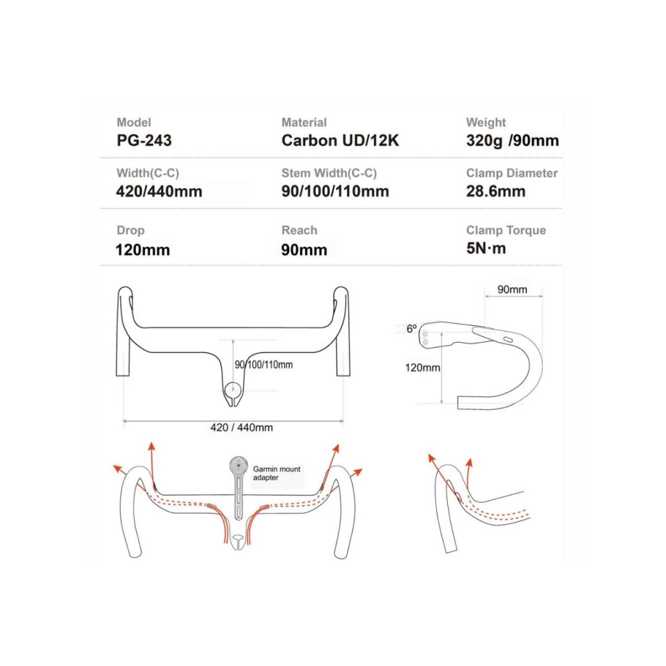 Der Progress PG-243 Carbon-Lenker und die Antriebseinheit verleihen Ihrem Rennrad eine bessere Aerodynamik, weniger Drehmoment und weniger Gewicht. Das HEA Design bietet maximale aerodynamische Vorteile, ohne dabei die hervorragende Ergonomie zu vergessen. Der 120 mm Drop und der 90 mm Reach bieten perfekten Sitz in allen Positionen, sicheren Halt und optimale Kontrolle über Ihr Fahrrad. Interne Kabelführung durch den halbintegrierten Lenker. Mit 2 unteren Schrauben am Vorbau zur Befestigung der Fahrradcomputer-Kupplung. Eigenschaften: Material: UD-Kohlefaser. Disziplin: Straße. Breite: Optionen von 44 cm und 42 cm von Mitte zu Mitte. Kraftlänge: 90 mm Leistungswinkel: -6º. Vorbaubefestigung: 1-1/8". Tropfen: 120 mm. Reichweite: 90 mm. Farbe: Schwarz. Gewicht: 319 g (420 mm/90 mm) Kabelführung: Interner Lenker (Di2). Anzugsdrehmoment: 5 Nm Festigkeitsteststandard: ISO-4210-2 2015 |