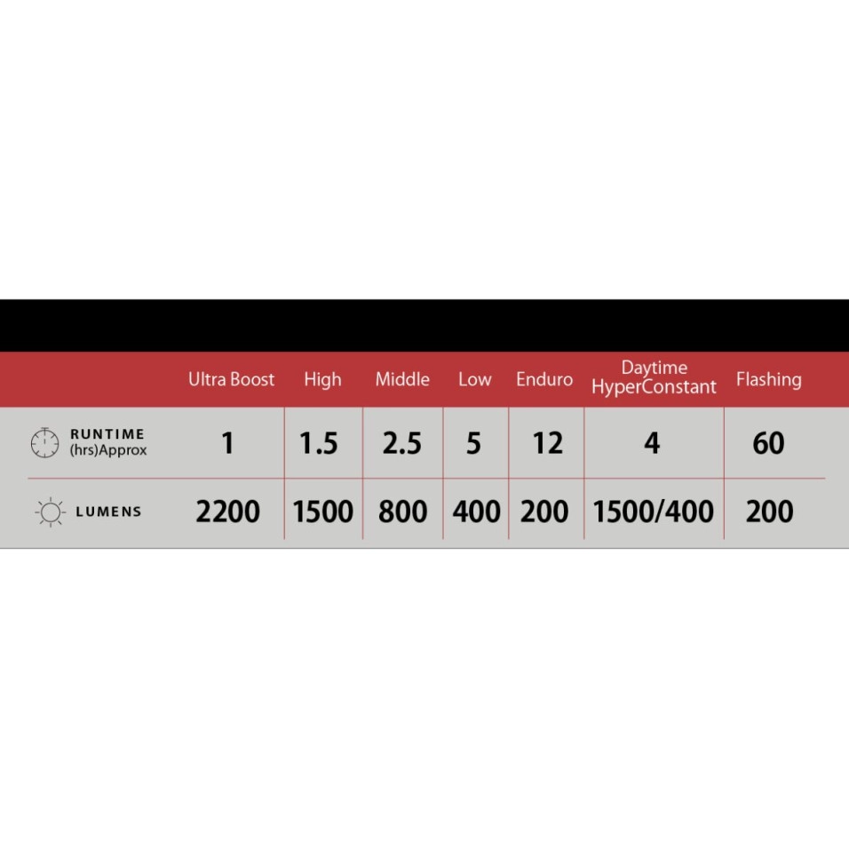 Eigenschaften: . Hochleistungs-Akku-Stirnlampe (2200 lm) . Leistungsstarker Breitstrahl mit OptiCube™-Linsentechnologie . Hervorragende seitliche Sicht . Robustes Aluminiumgehäuse . Wiederaufladbarer Lithium-Ionen-Akku (Li-Ion 3,6 V 5000 mAh) . 3-stufige Batterieanzeige (Blau: Mehr als 50 % Orange: 50–20 % Rot: Weniger als 20 %) . Wiederaufladbar über USB-C (USB-C-Kabel nicht im Lieferumfang enthalten) . Modusspeicherfunktion . Sieben Lichtmodi (Ultra Boost / Hoch / Mittel / Niedrig / Enduro / Daytime HyperConstant / Blinkend) . Aktivieren Sie den Ultra Boost-Modus, indem Sie doppelt auf den Netzschalter klicken . Der Sperrmodus verhindert, dass das Licht versehentlich aktiviert wird . FlexTight™-Unterstützung . helm und Mittelgabelhalterung (optional) Technische Spezifikationen: . Abmessungen: 43,5 x 117 x 40 mm . Gewicht: 213,5 Gramm (Licht und Batterie) . Lichtquelle: Weiße LED X1 . Ausführungszeit: - Ultra Boost-Modus 2200 Lumen: 1 Stunde - High-Modus 1500 Lumen: 1,5 Stunden - Mittlerer Modus 800 Lumen: 2,5 Stunden - Low-Modus 400 Lumen: 5 Stunden - Enduro Modus 200 Lumen: 12 Stunden - HyperConstant-Modus tagsüber 1500/400 Lumen: 4 Stunden - Blinkmodus 200 Lumen: 60 Stunden . Batterie: Li-Ionen-Akku ( 3.6V-5000mAh ) . Ladezeit: ca. 4 Stunden (2A) . Wasserbeständigkeit: IPX4 Technologien: OptiCube™ Unsere patentierte OptiCube™-Linsentechnologie maximiert die Helligkeit für eine bessere Sicht. FlexTight™-Unterstützung Die FlexTight-Halterung lässt sich schnell und sicher am Lenker befestigen und bietet eine Feineinstellung ohne Werkzeug. Seitliche Sichtbarkeit Bietet seitliche Sicht zur Erhöhung der Sicherheit. Tageszeit Es kann tagsüber verwendet werden. Allwetter IPX4 Es kann bei Regenwetter verwendet werden. USB-C Schnelles Laden |