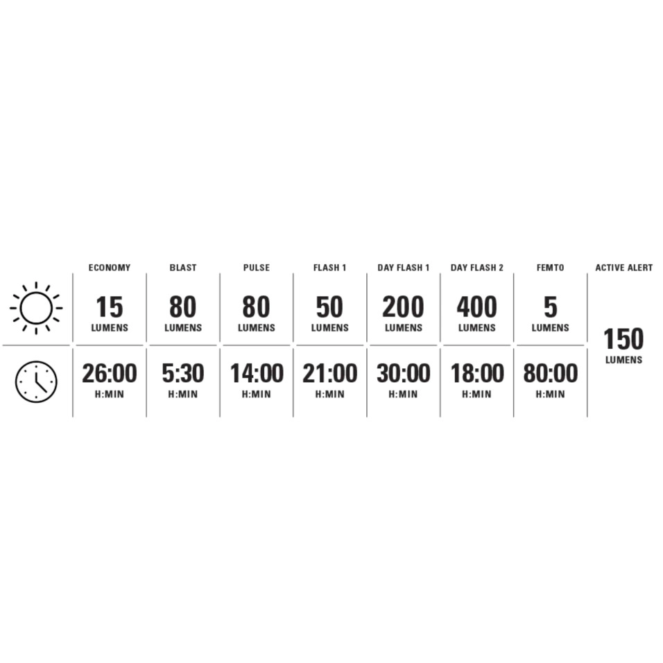 SPEZIFIKATIONEN: Max. Lumen: 400 Maximale Autonomie: 80 Stunden Batteriekapazität (mAh): 1900 Ladetyp: USB-C Gewicht: 71g Abmessungen: 70 mm, 37 mm, 47 mm Eigenschaften: IPX7, Tageslichtblitz, Alarm |
