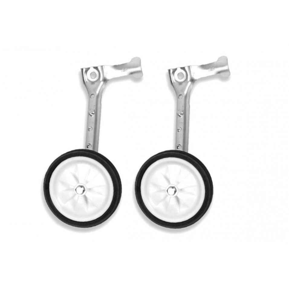 Höhenverstellbare Seitenstabilisatoren für Kinderfahrräder von 350A bis 500A und von 16" bis 20" Art der Befestigung an der Nabenachse mit Gewinde an der Seite des Rahmens. Inklusive Achsadapter zur Montage an Fahrrädern mit Kettenschaltung. Räder mit 120 mm Gummilauffläche. |