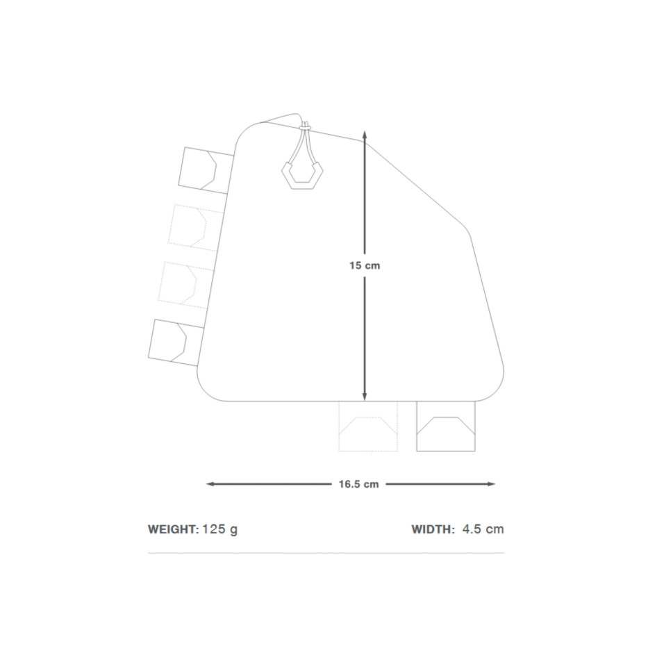 Die hintere Oberrohrtasche ist für moderne Mountainbike-Geometrien konzipiert und passt besser an die Rückseite des Oberrohrs, als einfach einen Backcountry-Oberrohrrucksack umzudrehen. Es ist ideal zum Aufbewahren von Snacks, Werkzeugen und allem, was Sie immer griffbereit haben möchten, und lässt sich mit Hypalon-verstärkten Klettbändern, die den Abrieb minimieren, sicher am Oberrohr und an der Sattelstütze befestigen.