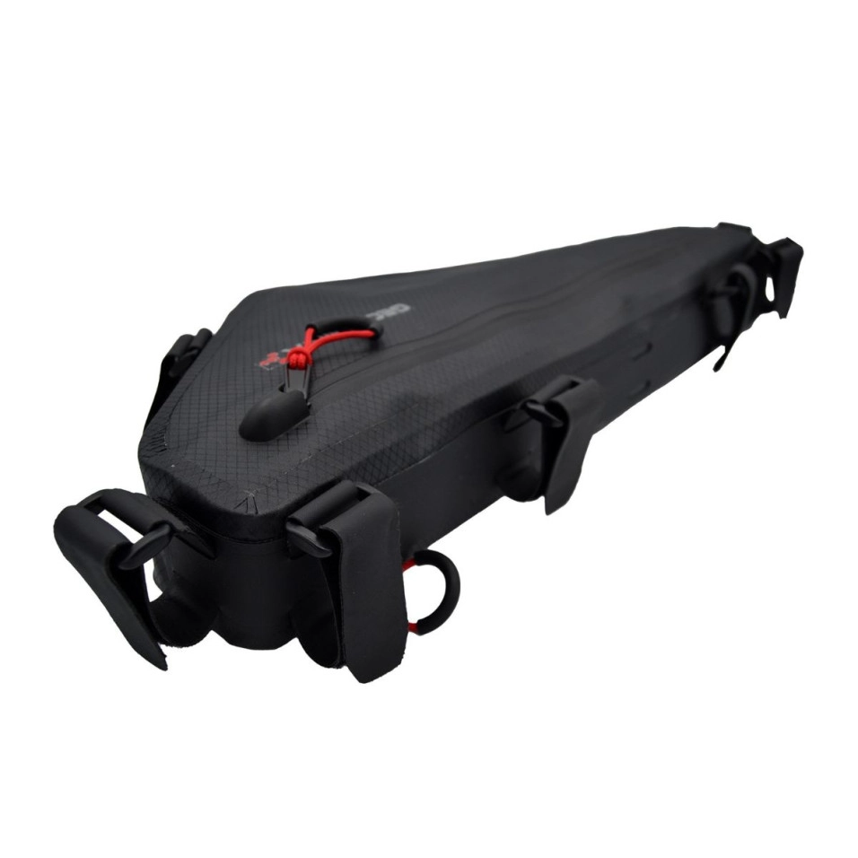 Hergestellt aus 600D-Nylon mit innenliegendem TPU-Laminat und nahtlos hochfrequenzverschweißt, garantiert es absolute Wasserdichtigkeit. Das Obermaterial ist zudem mit einer PU-Beschichtung versehen, die Wasser abweist und an der Luft schnell trocknet. Es verfügt über ein gepolstertes Innengestell, das Stabilität bietet, Gegenstände vor Stößen schützt und seine Form während des Transports beibehält. Der Innenraum ist mit gelbem 210D Ripstop-Nylon mit TPU-Laminat ausgekleidet, was das schnelle Auffinden des Inhalts erleichtert und für eine übersichtliche Aufbewahrung sorgt. Das neue „ Gravel “-Design eignet sich besonders für Fahrräder mit langem Steuerrohr oder Rennrad-/ gravel und ermöglicht zudem die Montage von flachenhalter am Unterrohr. Details wie reflektierende Logos verbessern die Sichtbarkeit bei schlechten Lichtverhältnissen. Hauptmerkmale |