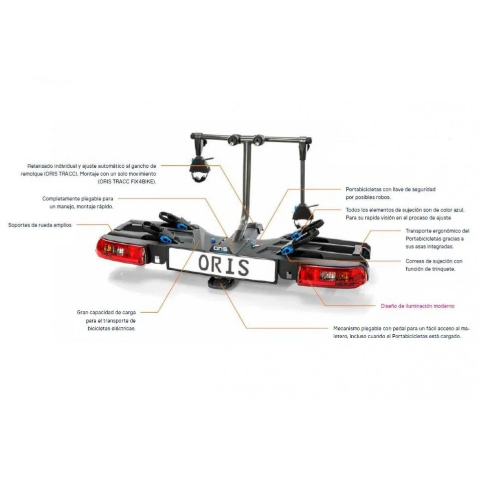 Mit dem Fahrradträger Oris Tracc Bola können Sie zwei Fahrräder transportieren, sowohl herkömmliche als auch elektrische. Diese Ladekapazität kann mit der optionalen Erweiterung auf 3 Fahrräder erweitert werden. Der Oris Tracc Fahrradträger ist ein sehr widerstandsfähiger und stabiler Fahrradträger mit Anhängerkupplung, einfach zu bedienen und mit einem praktischen Klappsystem für den Zugang zum Kofferraum.