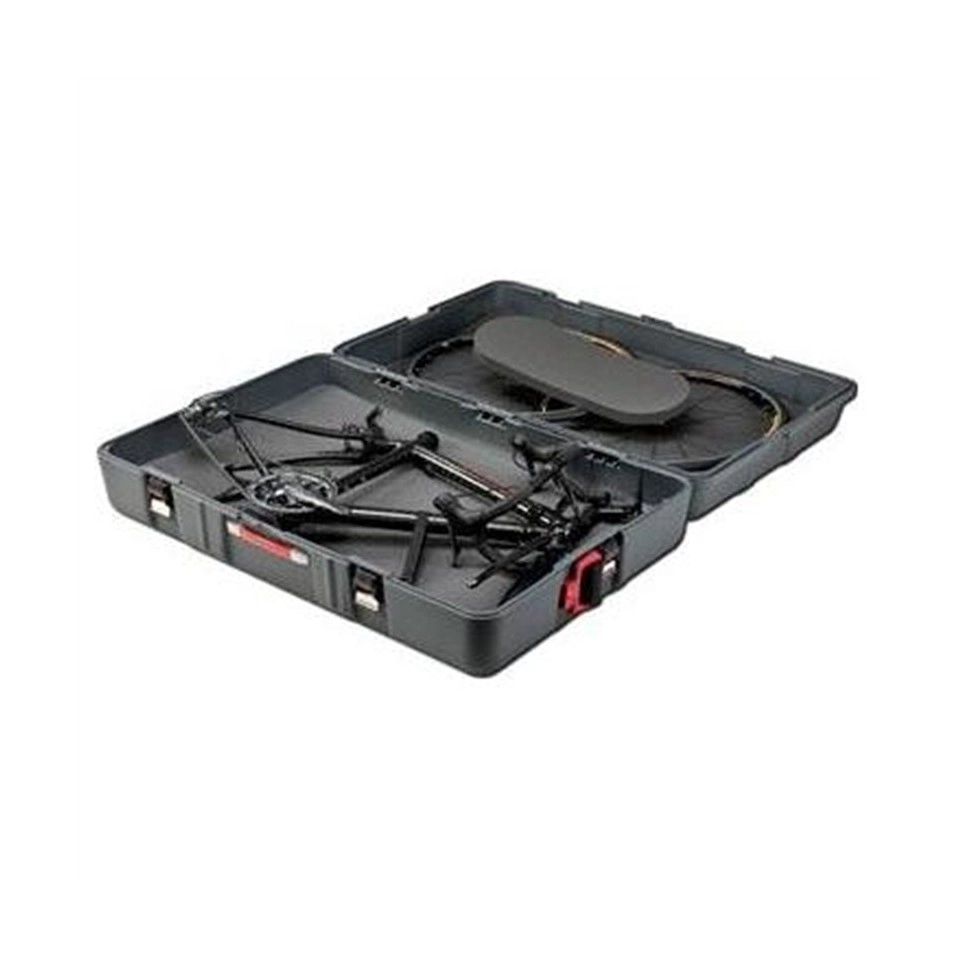 Merkmale Elite Vaison-Koffers: ·Extra harter Koffer mit Doppelwand aus hochdichtem Polyethylen. ·Kompatibel mit Mountainbikes und Rennrädern, mit Federung und Bremsen und Rahmen bis 62 cm. ·Das Verstauen des Fahrrads im Koffer ist dank der Scharniere, die eine 180°-Öffnung ermöglichen, besonders einfach. ·Reißverschlüsse mit integriertem Schloss verhindern möglichen Diebstahl beim Transport. ·Zwei Streifen an den Seiten erleichtern den Transport zusammen mit den unteren Rädern.