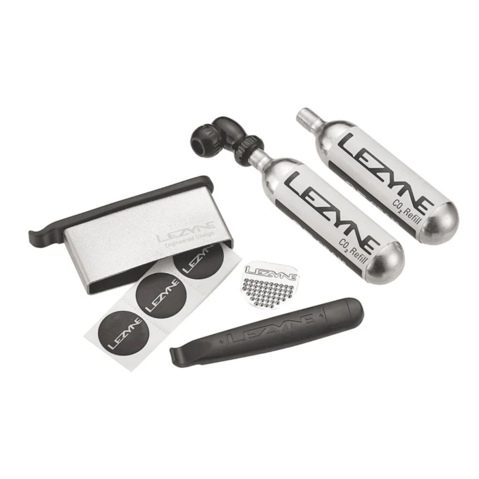 Escapa bringt mit dem Lezyne Twin Kit 2x16gr CO2 Kit ein komplettes und kompaktes Set zum Aufpumpen und Reparieren von Fahrradreifen im Notfall. Inklusive Inflator, CO2-Kartuschen und Hebel.