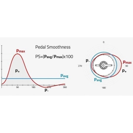 Indica el número de revoluciones hechas por el pedal en un minuto (rpm). Eficacia del par (TE): indica, como un porcentaje, la cantidad de potencia generada durante un golpe de pedal en realidad contribuyó a la propulsión del ciclista. Este valor se basa en la Potencia Positiva (P +), que empujó el pedal hacia adelante, y la Potencia Negativa (P -), que empujó en la dirección opuesta, aplicada a la manivela en cada revolución. La potencia negativa se puede contrarrestar ayudando al pie a "volver a subir" en la fase de recuperación: tirando de él por el zapato engranado. Suavidad del pedal (PS): indica, como un porcentaje, qué tan uniformemente distribuida está la potencia en una revolución completa de un golpe de pedal. Un valor de 100% significa que la potencia se entrega constantemente a lo largo de toda la revolución: cuanto mayor sea el valor, más "redondeado" será el pedaleo. |