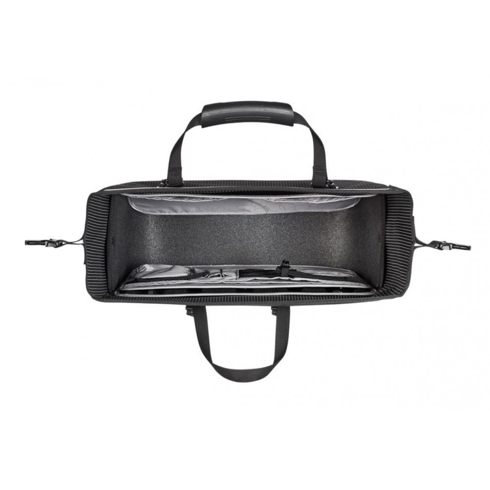 Negra y elegante durante el día. De noche un escudo de protección reflectante: La Alforja Ortlieb OfficeBag High Visibility QL2.1 21L se presta de manera ideal para el viaje a la oficina: en la práctica bolsa caben dos carpetas DIN A4, lápices, etc.