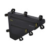 Sistema de fijación: Tres correas de estabilidad de Hypalon se fijan al tubo superior . Tres correas de estabilidad de Hypalon se fijan al tubo inferior . Dos correas de estabilidad de Hypalon se fijan al tubo del sillín. Los paneles Frame-fit se adaptan a la forma del cuadro . La impresión de silicona en las correas y los bordes de la mochila ayuda a mantener la estabilidad. Estructura reforzada
