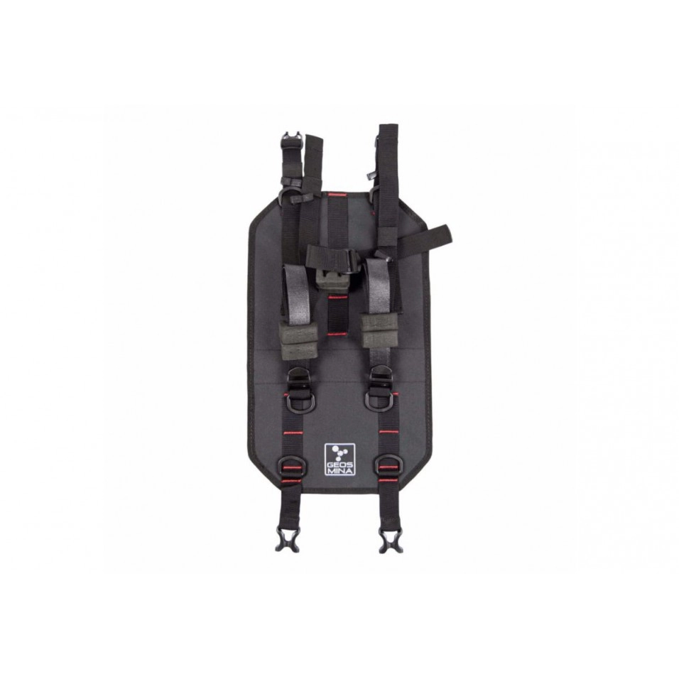 El arnés de la Bolsa Manillar Geosmina Harness Roll Bag está fabricado en termoplástico de alta resistencia y forrado en Nylon 600D. Dispone de varias hebillas que permiten añadir objetos y carga extra con la ayuda de correas auxiliares. El arnés se fija al manillar mediante correas sobredimensionadas y tensores YKK de altas prestaciones, que permiten su uso con una sola mano. Las pastillas de espuma de alta densidad intercambiables estabilizan la carga además de filtrar las irregularidades y permitir una adaptación del arnés a la bici y manillar totalmente configurable al gusto del ciclista.