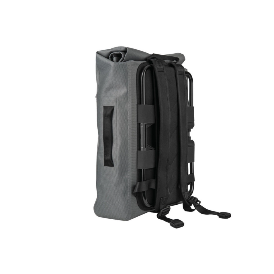 La Bolsa Brompton Borough Waterproof Backpack tiene unas correas para los hombros cómodas de llevar y de perfil bajo, que se sujetan al instante mediante imanes ocultos cuando llega el momento de montar.