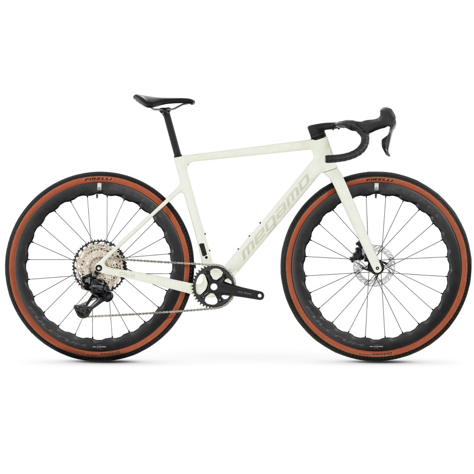 CARACTERÍSTICAS PRINCIPALES · Carbon Advanced Composite Super Light Race Gravel frame with full internal cable routing · Carbon Advanced Composite Gravel fork with full internal cable routing · Shimano GRX Di2 1x12-speed drivetrain · Fulcrum Sharq Full Carbon · Pirelli Cinturato Gravel RC Classic tires · Manillar Integratted Internal Cable Routing / XS size 70 x 360 x 410 mm / S size 80 x 360 x 410mm / M size 90 x 360 x 410 mm / L size 100 x 380 x 430 / XL size 110 x 380 x 430 · Longitud Bielas ; XS, S size 170 mm / M, L, XL size 172,5 mm