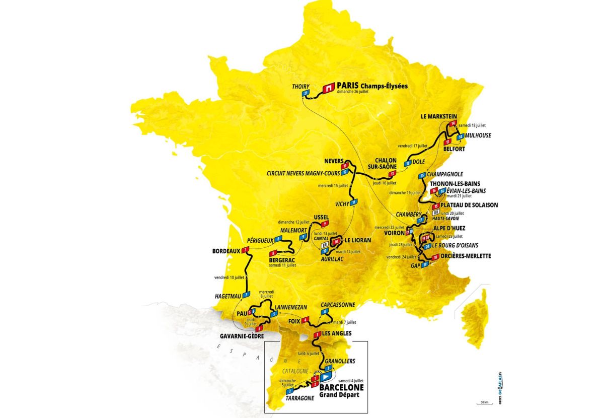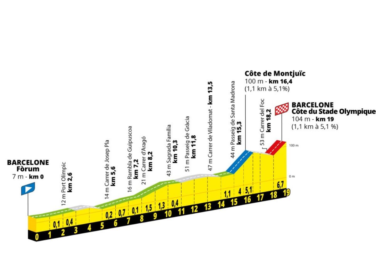 La prueba comenzará con una contrarreloj por equipos de 19 km que saldrá y volverá a Barcelona, recorriendo puntos emblemáticos de la ciudad como la Sagrada Familia y culminando en el Estadio Olímpico de Montjuïc, con dos repechos cortos incluidos. Es la primera vez desde 1971 que el Tour arranca con una crono colectiva, una puesta en escena histórica y lineal que apostará por el trabajo en equipo desde el primer día.