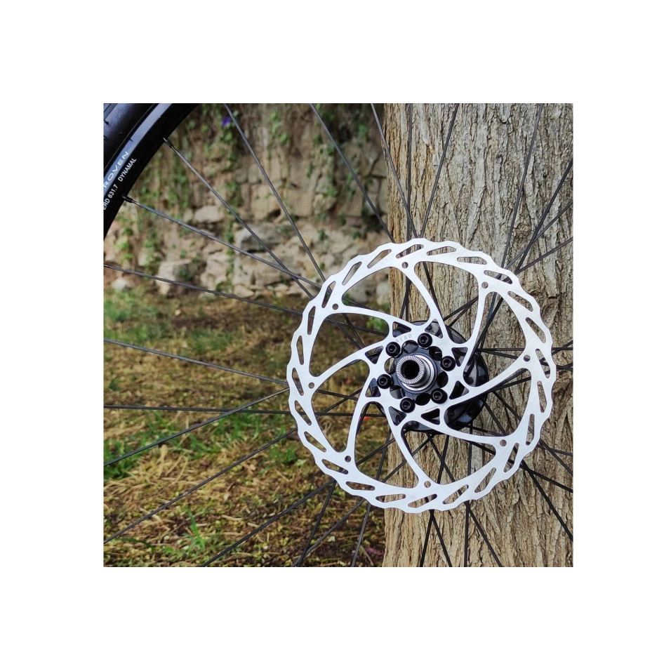 Disco de freno de acero con diseño para reducir el calor y mejorar la frenada. Tienen un acabado mecanizado para reducir la distancia de frenado. 6 tornillos Torx T25 incluidos en el kit. Discos de alta resistencia sin ruido ni vibraciones. Recomendado tanto para bicicletas eléctricas como para bicicletas de montaña. Características técnicas: Grosor: 1,8mm Diámetro: 180mm Peso: 110g Frenado potente, progresivo y modular. Sin ruidos ni vibraciones. Resistencia a altas temperaturas. Tratamiento anticorrosión. Alta eficacia en seco y mojado. Sistema universal de 6 tornillos (incluidos) Material: Acero - MTB, Enduro, Descenso, E-Bikes...