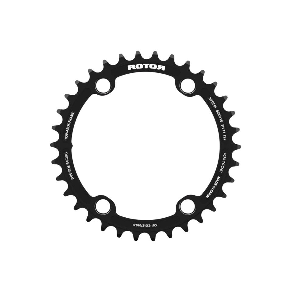 La empresa española no solo ha cambiado ligeramente su diseño; un nuevo perfil de dentado los hace compatibles con las cadenas Shimano HG de 12 velocidades y, por lo tanto, con los últimos grupos Shimano de carretera de 12 velocidades. Gracias a su círculo de pernos asimétrico de 110 milímetros, los platos se pueden montar en bielas Rotor ALDHU/VEGAST y en todas las bielas Shimano de carretera de 11/12 velocidades (incluidas las bielas con potenciómetro Shimano). Especificaciones técnicas: Material: Aluminio 7075 T6 Diámetro de la rueda: 110 mm Montaje: Araña de 4 brazos (Shimano asimétrico) Compatibilidad de bielas: Rotor ALDHU | VEGAST | INSpider | INPOWER | 2INPOWER | Shimano Road | Medidor de potencia Shimano Road Compatibilidad de cadena: Shimano HG de 11 o 12 velocidades Montaje: Interno Ovalización: Ninguna Peso aproximado: 31 g (34 dientes) |