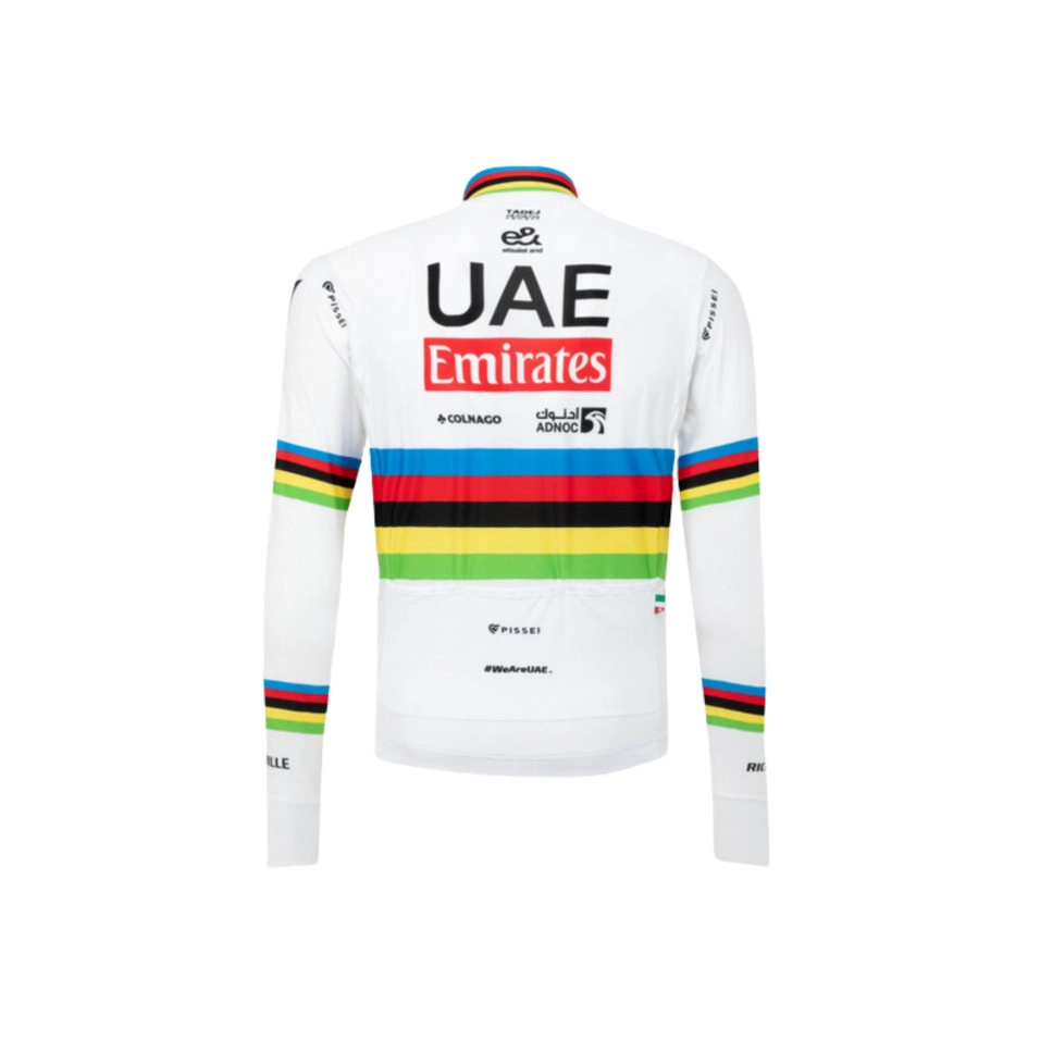 En Escapa te equipamos como el campeón del Mundo Tadej Pogačar, por este motivo te presentamos el Maillot Manga Larga Pissei World Champion Tadej Pogacar 2024 UAE Team Emirates. Este maillot largo es perfecto para entretiempo gracias a su tejido polar ligero y transpirable en su interior que garantiza una excelente retención térmica sin comprometer la transpirabilidad de la prenda.