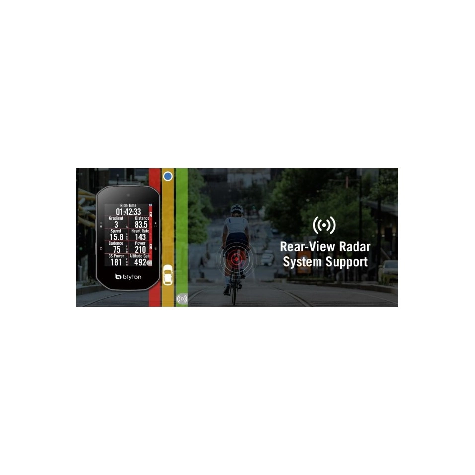 Grâce à un système de radar de recul ANT+ connecté, les cyclistes peuvent voir les véhicules derrière jusqu'à 150 m avec des notifications pour rester alertes. Les bandes situées sur le côté droit de chaque page de données clignoteront de différentes couleurs et émettront un bip pour avertir les utilisateurs de l'approche du trafic. |
