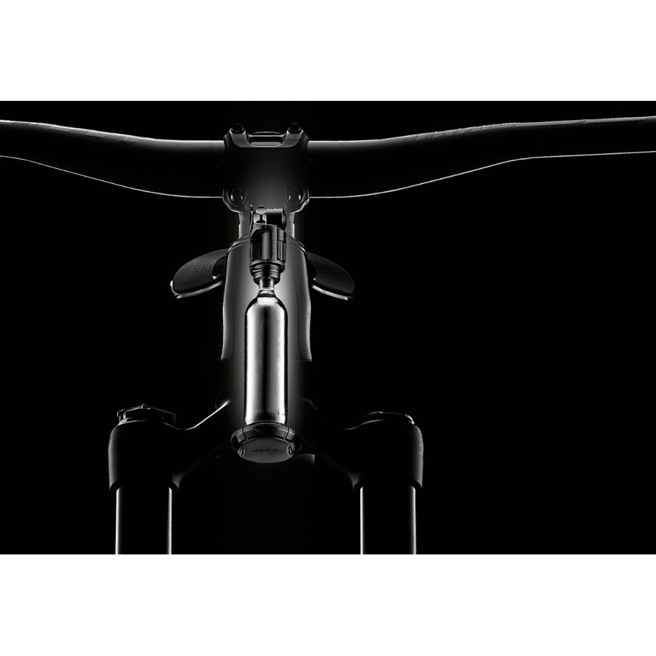Léger, solidement fixé et silencieux, mais facile d'accès lorsque vous en avez besoin, le kit de gonflage d'embrayage intégré à la fourche Giant utilise un capuchon magnétique pour enclencher intelligemment une cartouche de CO2 et un gonfleur directement dans le tube de direction de la fourche, ce qui vous permet de voyager sans bagages. .