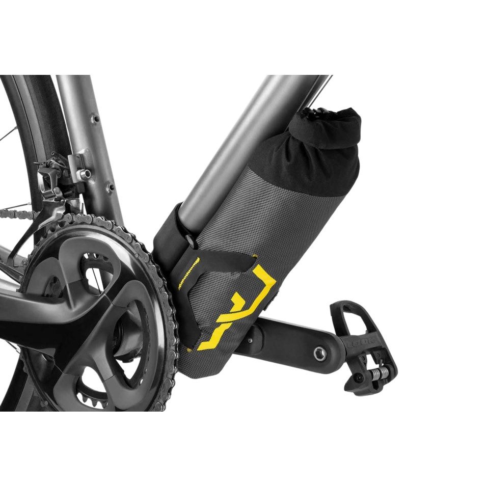 Le sac de cadre Apidura Expedition Pack 1,2 L est parfait pour ranger des objets sous le tube diagonal sans avoir besoin d'un support. Rangez ici les pièces de rechange ou les articles essentiels pour les longues distances et cela peut également être un bon endroit pour transporter de l'eau supplémentaire.