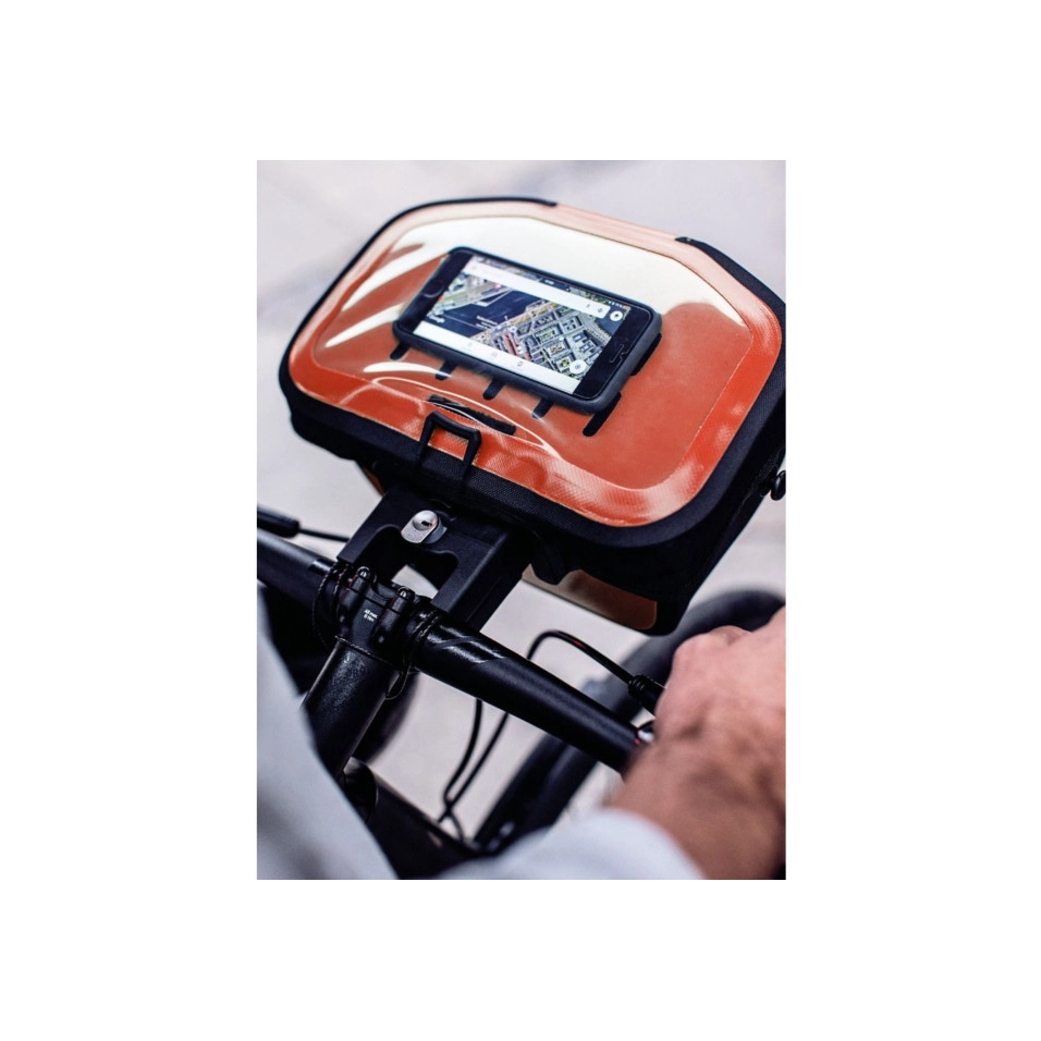 Une sacoche de guidon avec suffisamment d'espace, mais totalement sans PVC – l' Ultimate Free. Le compartiment transparent dans le couvercle (mesures intérieures utiles 22 x 10 cm) sert également de support optimal pour un smartphone, un système de navigation ou une carte. Grâce au film transparent et étanche, vous pourrez manipuler vos appareils mobiles en toute simplicité et contrôler votre navigation à tout moment. La bâche imperméable en tissu polyester enduit de PU garde les objets de valeur, les collations et tout ce qui doit être à portée de main, protégés et secs par tous les temps. Le couvercle verrouillable est doté d'une fermeture magnétique, ce qui facilite son utilisation d'une seule main. Grâce à une sangle amovible, vous pouvez à tout moment transformer la sacoche de guidon en sac à bandoulière à transporter lorsque vous laissez le vélo garé. En choisissant le bon support de guidon, l' Ultimate Free peut être facilement fixé au guidon des vélos standards et des vélos électriques.