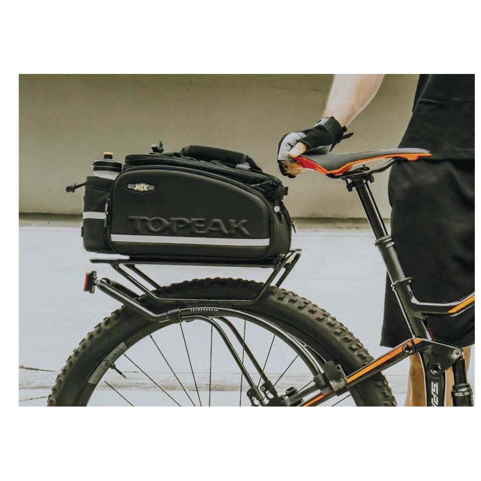 Ce grand porte-bagages arrière est doté d'une plaque supérieure innovante qui s'ajuste à plat quel que soit l'angle du hauban. Le système QuickTrack® intégré permet aux Topeak TrunkBags / TrunkBox de glisser, de se verrouiller en place et de se libérer en appuyant simplement sur un bouton. Le système de montage innovant par sangle Velcro s'ajuste solidement pour maintenir la charge stable et permettre le montage sur une large gamme de vélos. Il est également compatible avec les sacs du système KLICKfix® / RackTime® Snapit ou Vario . |