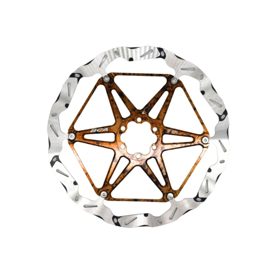 Les Disques BCA Performance 6 Trous 2.4mm Épaisseur se distinguent par leurs rainures et ailettes spéciales sur la piste pour mieux dissiper la chaleur et faciliter le refroidissement du disque.