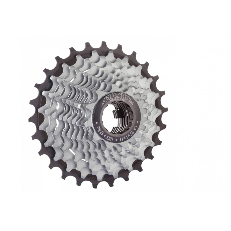 Escapa vous propose tous les composants et accessoires Miche pour votre vélo. La Cassette Miche Campagnolo Light Primato 11V 14-27 garantit une réduction de poids entre 8% et 12%, selon le modèle, par rapport au modèle standard. Il dispose de pignons en acier chromé très résistants, dont le dernier est en aluminium 7075 T6 anodisé.