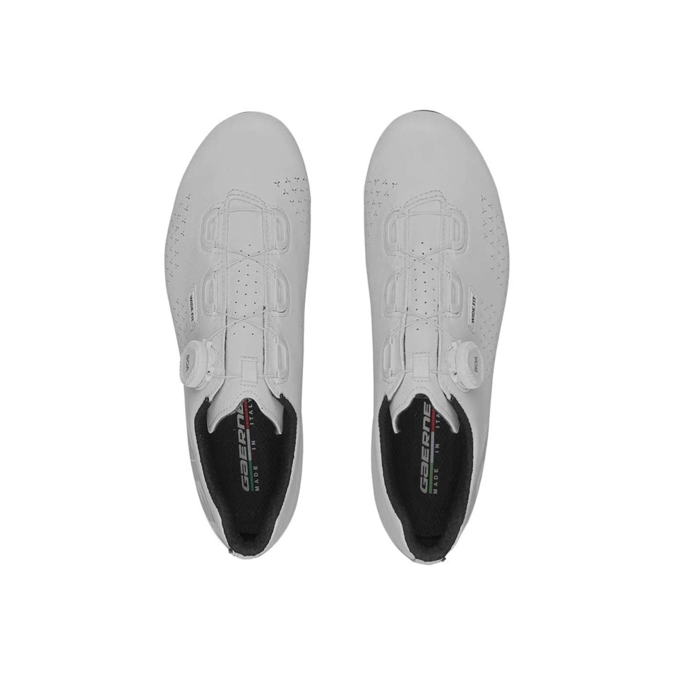 Caractéristiques principales. Système d'ajustement BOA® et molette en Y : fermeture micrométrique assurant un ajustement précis et uniforme sans points de pression. Gaerne EPS Carbon Power Sole 8.0 : fabriquée en nylon et en fibre de verre, elle offre l'équilibre idéal entre rigidité (niveau 8) et légèreté pour une transmission de puissance optimale. Talon antidérapant intégré : assure la stabilité du pied et améliore control dans tous les mouvements. Languette Comfort Fit : rembourrage interne pour plus de confort et de ventilation. Semelle intérieure respirante en EPS : soutien anatomique qui améliore l'efficacité du pédalage. Poids : environ 260 g |