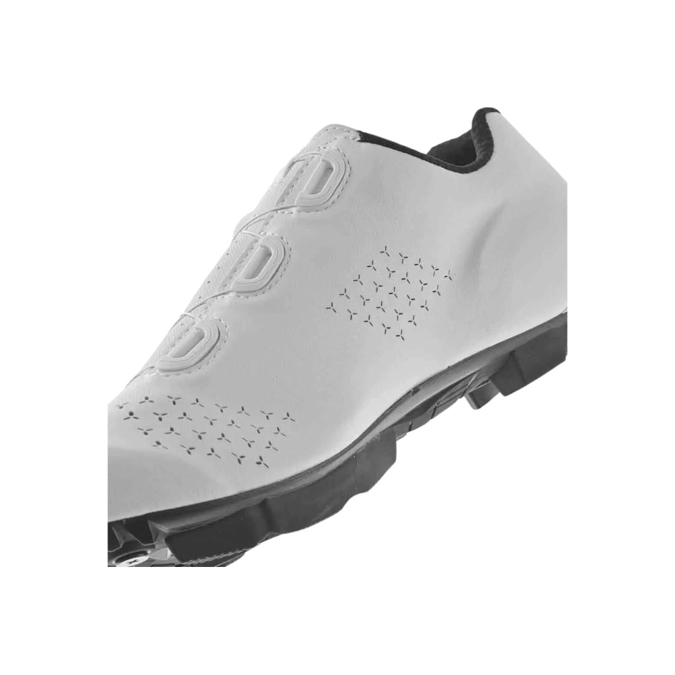 Caractéristiques principales. Système d'ajustement BOA® et molette en Y : fermeture micrométrique assurant un ajustement précis et uniforme sans points de pression. Semelle MTB 2Density 7.0 : fabriquée en nylon et en fibre de verre, elle offre l'équilibre idéal entre rigidité (niveau 7) et légèreté pour une transmission de puissance optimale. Talon antidérapant intégré : assure la stabilité du pied et améliore control dans tous les mouvements. Languette Comfort Fit : rembourrage interne pour plus de confort et de ventilation. Semelle intérieure respirante en EPS : soutien anatomique qui améliore l'efficacité du pédalage. Crampons avant amovibles : pour améliorer la traction sur les terrains boueux ou techniques. Poids approximatif : 339 g (taille 42). |