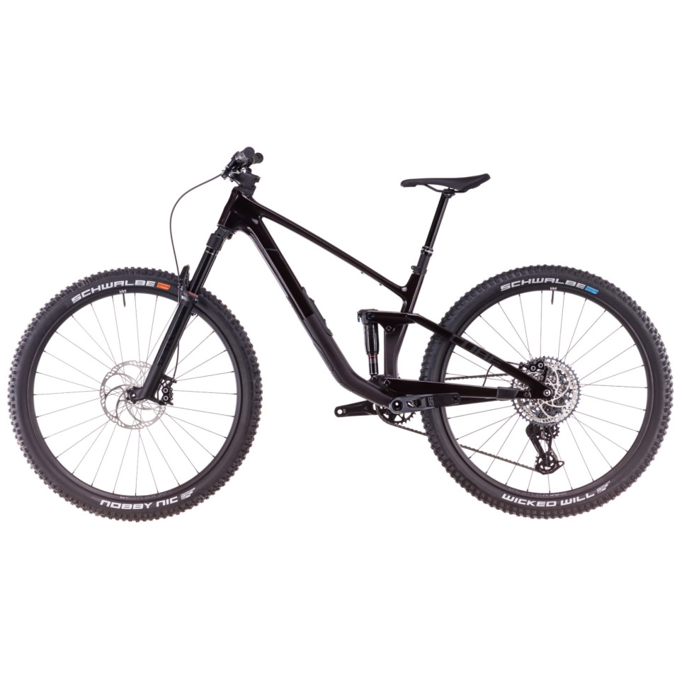 | Pneus (F) Schwalbe Nobby Nic, Super Ground, Addix Soft, Kevlar, 2.4 / (R) Schwalbe Wicked Will, Super Ground, Addix Speedgrip, Kevlar, 2.4 |