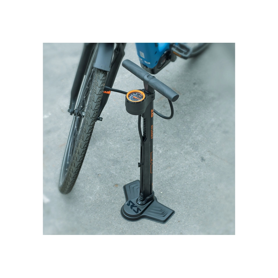 La pompa da officina SKS Airmotion 12.0 che presentiamo a Escapa è progettata per offrire un'esperienza superiore, raggiungendo pressioni fino a 12 bar con un volume di 343 cm³ per pompata. La base met , il tubo in acciaio da 715 mm e le finiture eleganti la rendono uno strumento di alta gamma, sia dal punto di vista tecnico che estetico.