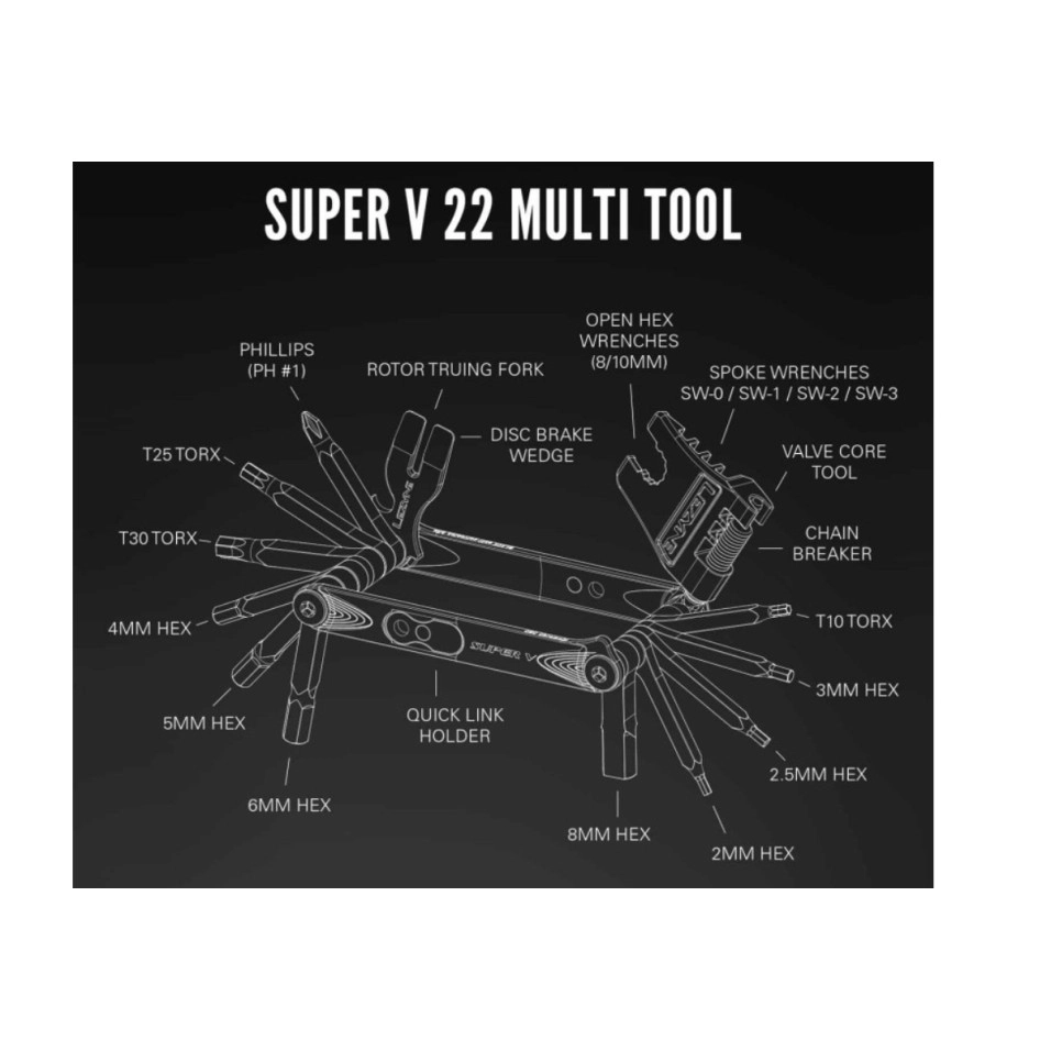 Le Multifunzione Lezyne Super V 22 includono una selezione essenziale di strumenti progettati per le moderne biciclette. Questi mini attrezzi sono progettati e realizzati direttamente da Lezyne e si contraddistinguono per una serie di caratteristiche innovative. Le piastre laterali ergonomiche sono fresate in alluminio leggero e anodizzate in nero. Le punte in acciaio sono ora più lunghe e trattate con tecnologia anticorrosione nera. Questi mini attrezzi compatti e versatili sono durevoli e progettati per far tornare i ciclisti sulla strada o sul sentiero in modo efficiente.