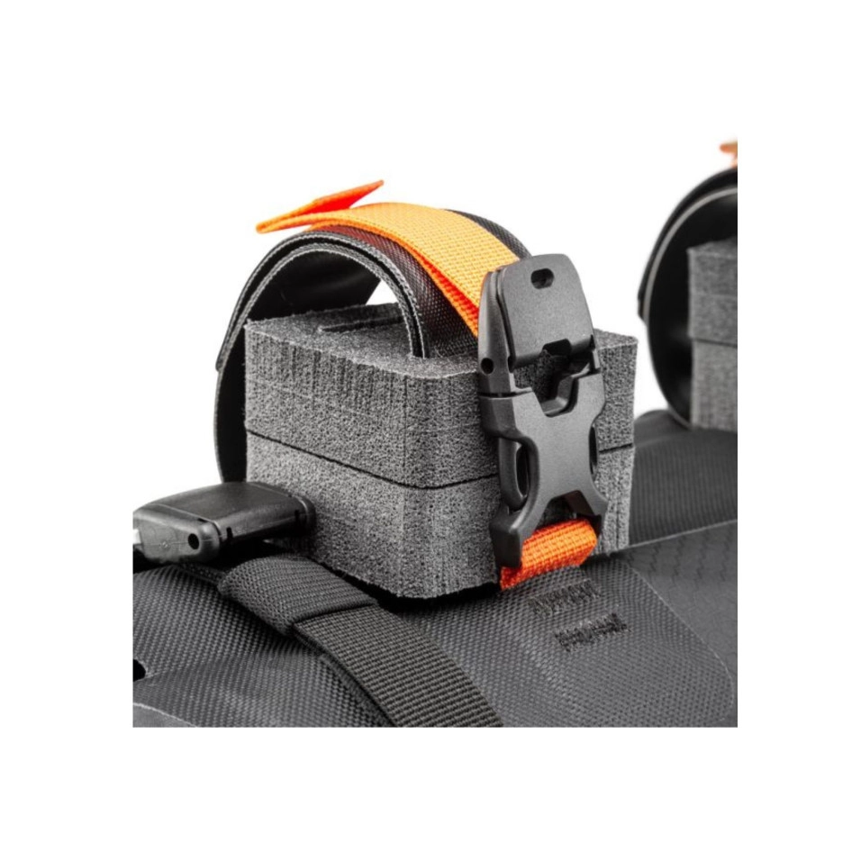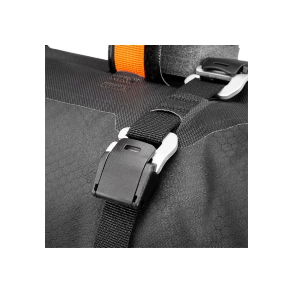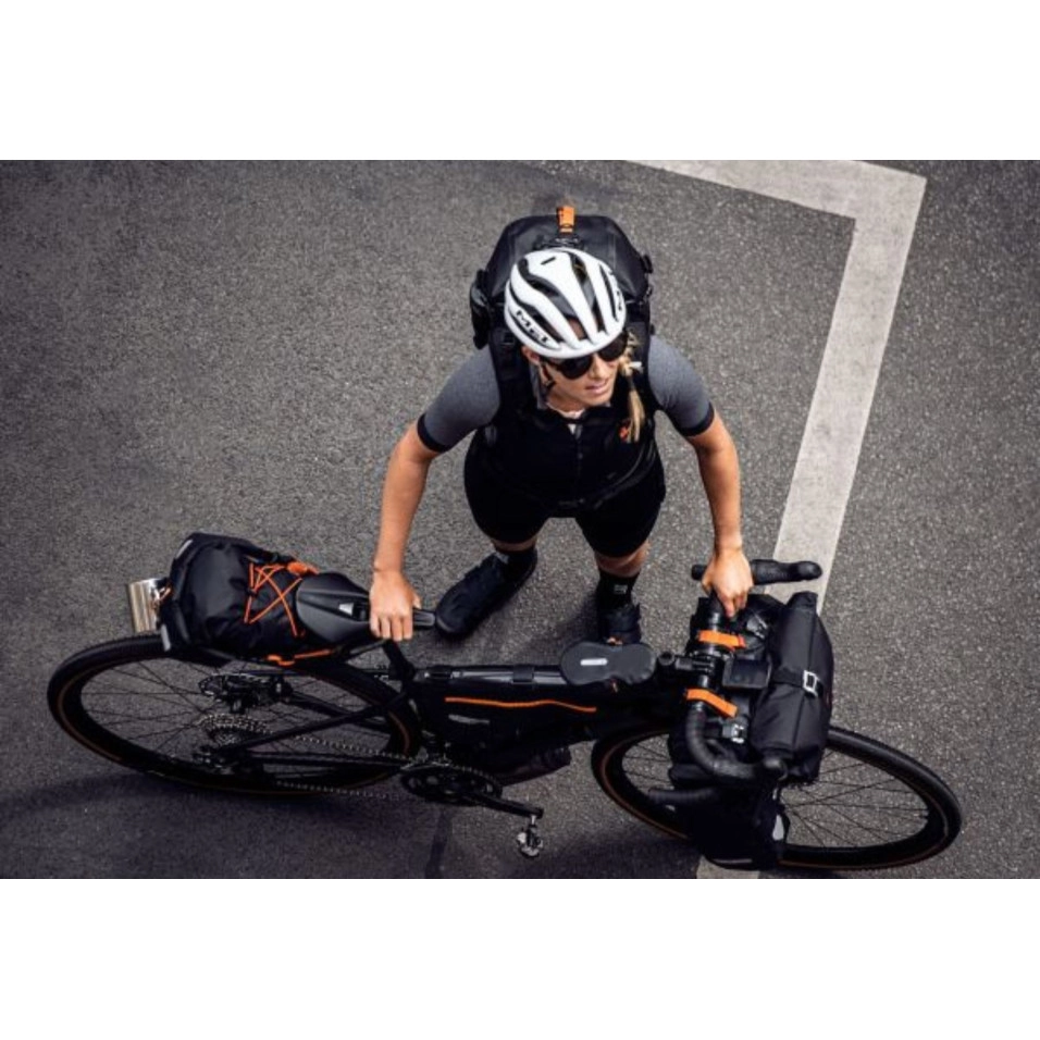 Con chiusure a rullo su entrambi i lati, è possibile accedere facilmente al contenuto della borsa. Le cinghie di compressione all'esterno consentono di fissare e conservare altri attrezzi. La borsa per manubrio è dotata anche di quattro ganci per fissare il pacchetto degli accessori. Il sistema di montaggio, composto da distanziali e due cinghie con chiusure in velcro ad alta aderenza nella parte inferiore, garantisce una solida fissazione a qualsiasi tipo di manubrio (anche in carbonio). Un rinforzo in plastica all'interno della borsa e il fissaggio al tubo di sterzo garantiscono una stabilità affidabile su tutti i terreni. Con una lunghezza di soli 45 centimetri, questa borsa per manubrio impermeabile è la soluzione ideale per chiunque voglia fare un giro in bicicletta con manubri curvi da fuoristrada, da corsa o da cross. Ganci di fissaggio per il pacchetto degli accessori Altezza: 16cm |
